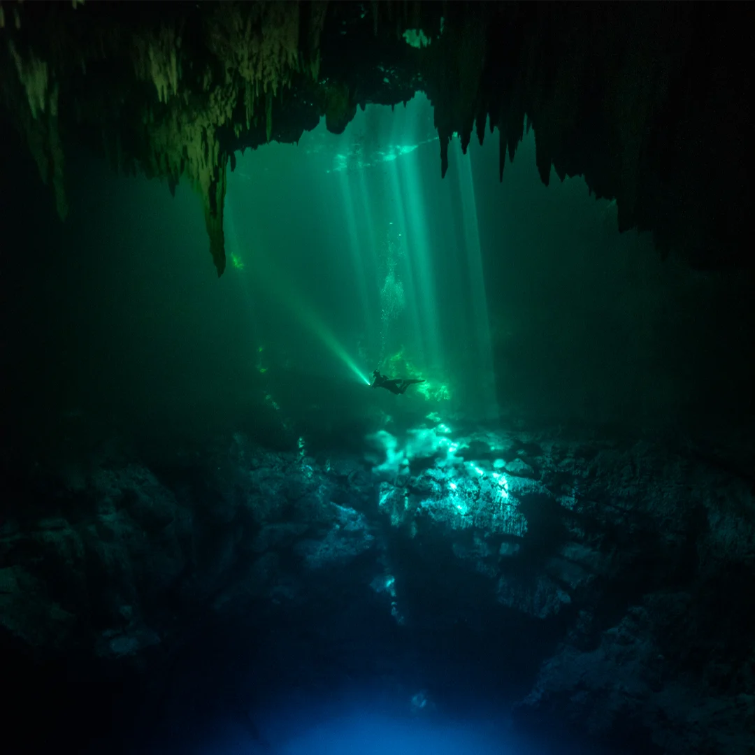 We leave the ocean behind and head into the jungle. You will dive a pristine Cenote (freshwater cavern) to fly through stalactites and stalagmites.
